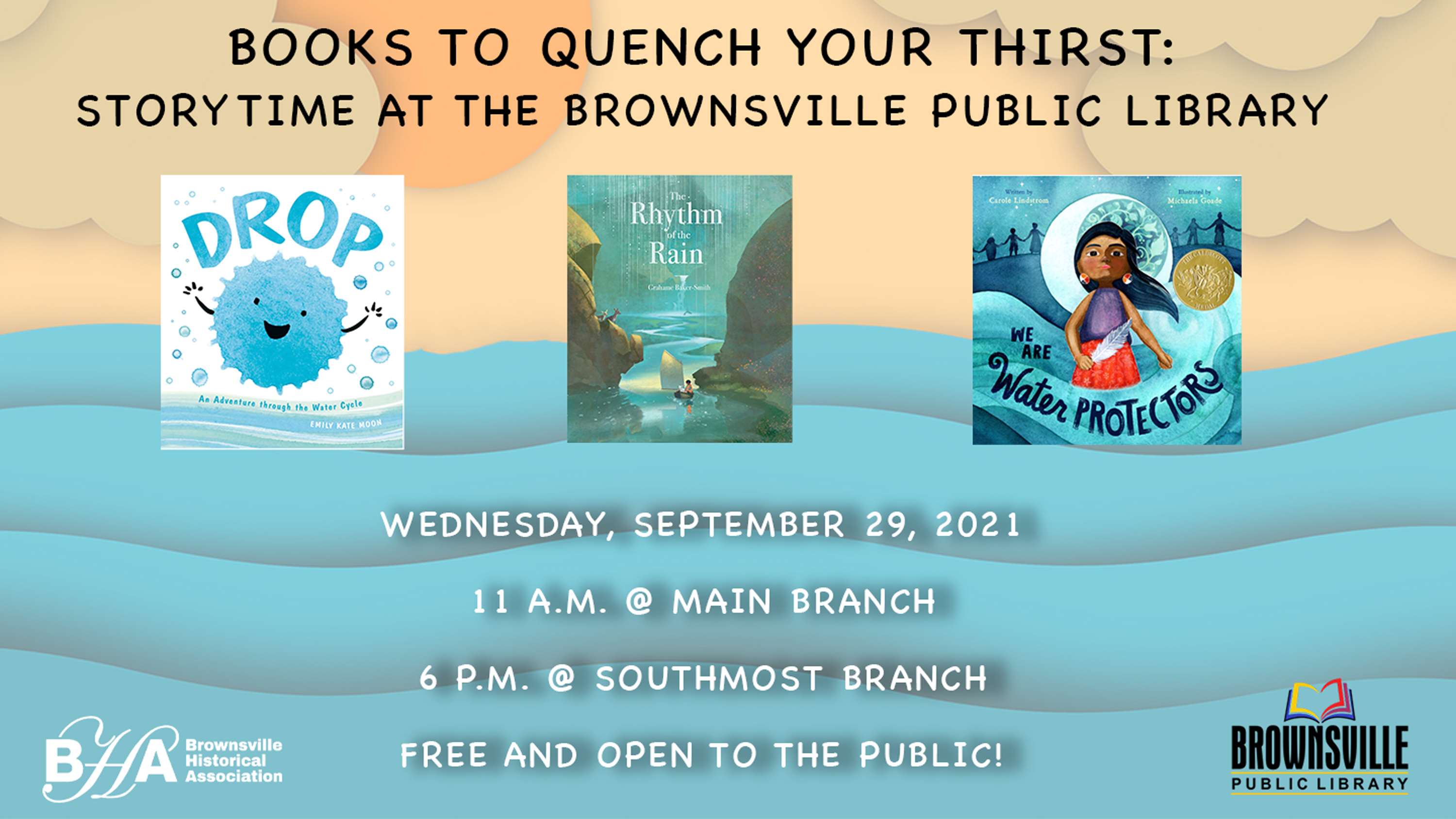 In collaboration with the Brownsville Public Library, stop by the Main Branch or Southmost Branch for a storytime and crafts for kids! The program combines the pleasure of a shared experience for parents and their children with stories about water and crafts about the water cycle. The books will include “Drop: An Adventure through the Water Cycle” by Emily Moon, “The Rhythm of the Rain” by Grahame Baker-Smith and “We Are Water Protectors” by Carole Lindstrom. Please follow us on our social media platforms for more information.